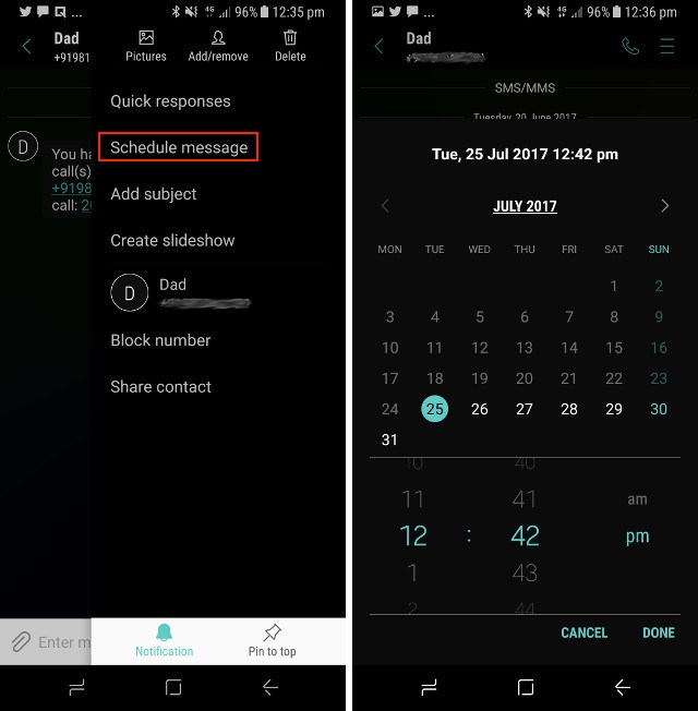 Pour vérifier si votre téléphone intelligent possède ou non cette fonctionnalité, ouvrez un message ou une conversation dans l’application des messages natifs et appuyez sur le menu 3 points (options) dans le coin supérieur droit. Vous devriez voir une option pour envoyer des messages programmés si votre combiné le prend en charge. Par exemple, sur mon Samsung Galaxy S8, lorsque j’ai saisi le menu des options dans une conversation, j’ai une option pour créer un message de planification. L’image ci-dessus représente la même chose. Sinon, utilisez l’une des applications ci-dessus pour profiter de cette fonctionnalité.