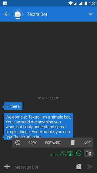 Ici, vous pouvez sélectionner la date et l’heure lorsque vous souhaitez envoyer votre message depuis votre téléphone. Une bonne chose à propos de Textra est qu’il marque les messages programmés avec une icône d’horloge verte. Lorsque vous appuyez sur l’icône, vous pourrez voir l’horodatage (quand il est programmé pour être envoyé) pour ce message. Pour l’essentiel, l’application est gratuite pour les achats dans l’application pour débloquer certaines fonctionnalités supplémentaires.