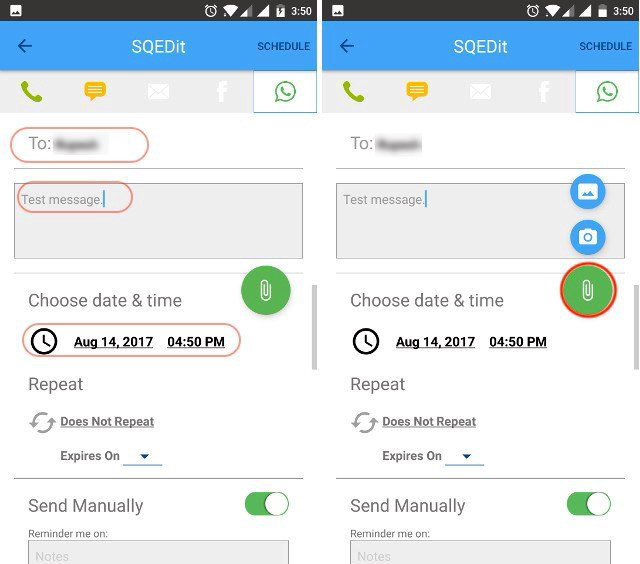 4. Une fois que vous avez terminé les autorisations, lancez l’application à nouveau et appuyez sur l’icône WhatsApp. Ici, vous pouvez planifier vos messages en choisissant le contact et la date et l’heure. Vous pouvez même ajouter une pièce jointe en appuyant sur le bouton de fixation.