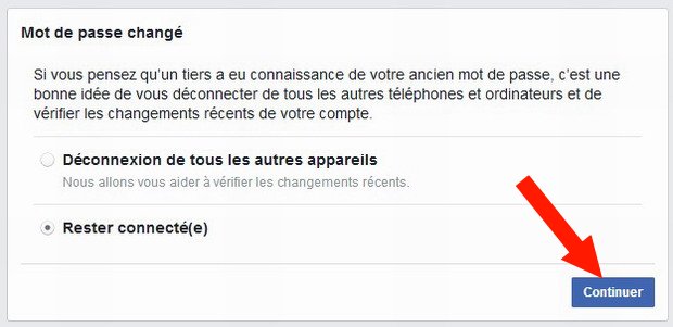 Après avoir réinitialisé votre mot de passe, Facebook vous permet de vous déconnecter des sessions actives sur d’autres appareils ou de rester connecté.