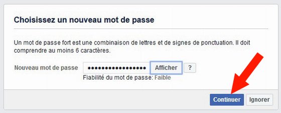 Tapez le nouveau mot de passe Facebook que vous souhaitez utiliser, puis cliquez sur le bouton Continuer.