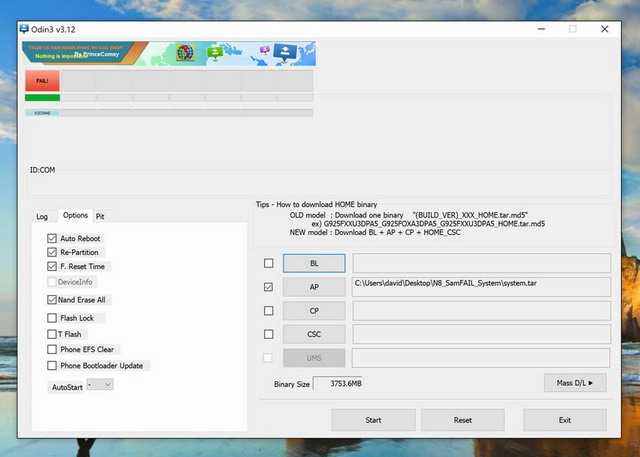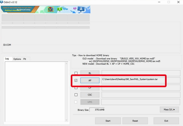 5. Dans Odin, cliquez sur le bouton AP et sélectionnez le fichier system.tar dans le dossier SamFail System nouvellement extrait.