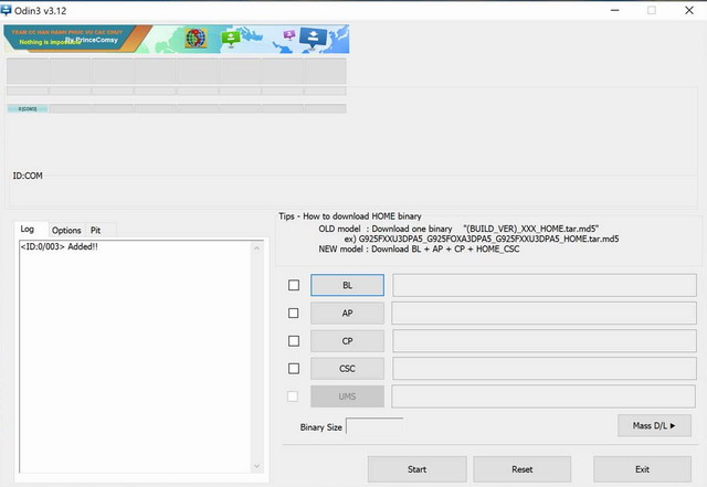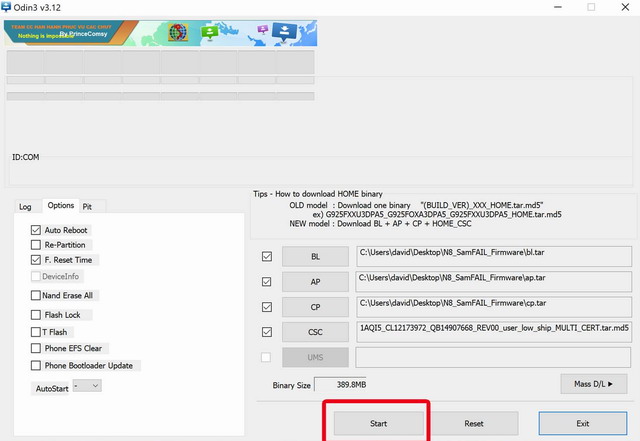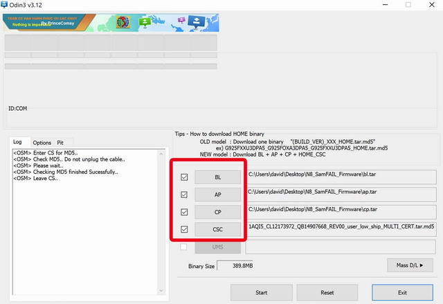 11. Cliquez sur BL dans Odin et sélectionnez le fichier BL dans le dossier nouvellement extrait. Puis cliquez sur AP et sélectionnez le fichier AP. Cliquez sur CP et sélectionnez le fichier CP. Enfin, cliquez sur CSC et sélectionnez le fichier CSC.