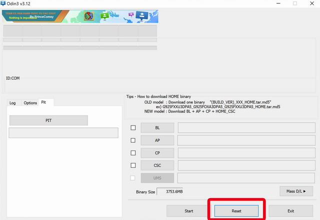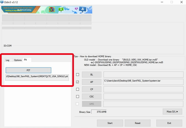 6. Sélectionnez l’onglet PIT sur la gauche dans Odin. Cliquez sur PIT et sélectionnez le fichier .pit à partir de ce même dossier.