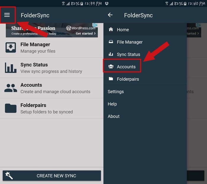 Autre que WhatsApp, nous aussi besoin d’une autre application appelée FolderSync Lite. Une fois que vous installez l’application, vous devrez donner l’application à accéder à vos photos, les médias et les fichiers. Sur la page principale Apps, appuyez sur l’icône du hamburger en haut à gauche et choisissez Comptes. Appuyez sur le bouton vert et sélectionnez l’option Dropbox.