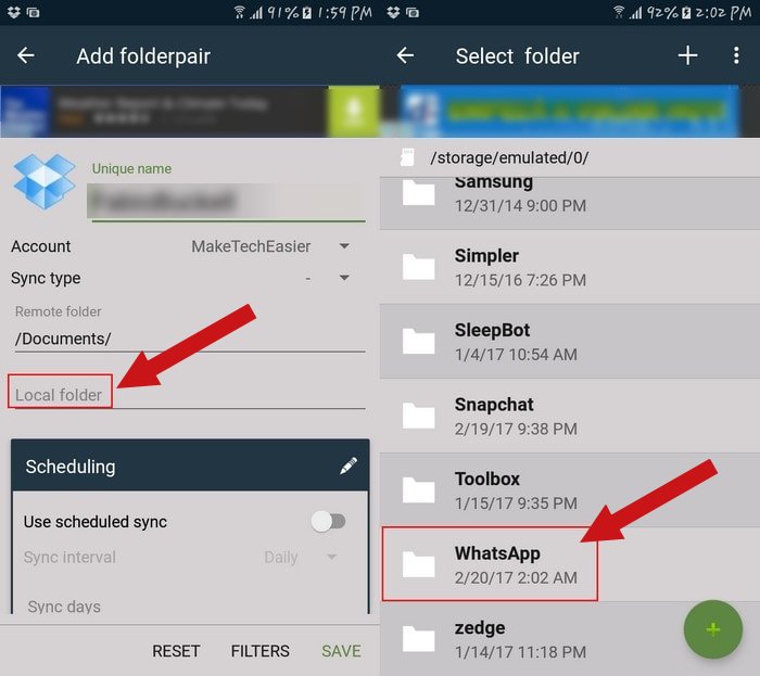 Sélectionnez l’option dossier local et faites défiler vers le bas jusqu’à ce que le dossier WhatsApp. Appuyez sur et décider si vous souhaitez sauvegarder tous les dossiers ou seulement un.