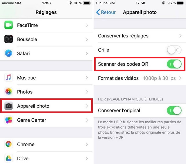 Si vous ne voyez pas de fenêtre contextuelle de notification même si le code QR est bien éclairé et bien visible, vérifiez que la fonctionnalité est activée. Allez dans Réglages, puis sur Appareil photo. Assurez-vous que Scanner des codes QR sont activés (et devraient être activés par défaut).