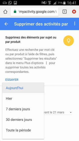 Une fois que vous avez sélectionné l’entrée appropriée, vous pouvez choisir une plage de dates à supprimer: aujourd’hui, hier, les 7 derniers jours, les 30 derniers jours et toutes les heures. Choisissez votre poison, puis appuyez sur le bouton « Supprimer ».
