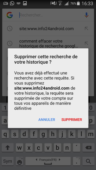 À partir de cette liste, appuyez longuement sur celle que vous souhaitez supprimer. Un avertissement s’affiche pour vous demander si vous souhaitez supprimer définitivement la requête de recherche de votre historique. Appuyez sur « Supprimer » pour le rendre officiel.