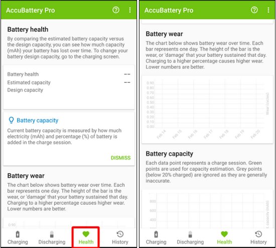 Remarque: Il existe des versions gratuites et Pro (3,99 $) AccuBattery disponibles, mais vous n’aurez pas besoin de la version Premium pour surveiller la santé de votre batterie. Si vous appréciez cette fonctionnalité, cependant, je vous encourage à acheter la version Premium et à soutenir le développement de cette excellente application. La version Premium supprime les publicités et vous permet également d’ouvrir une superposition pour vérifier les statistiques de la batterie et du processeur au-dessus des autres applications.