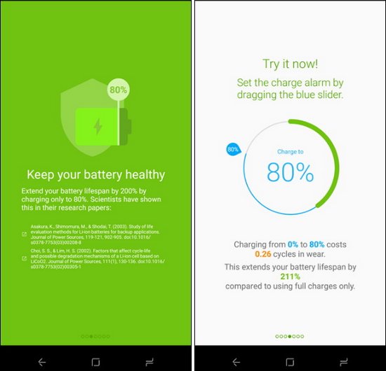 La page suivante vous permet également de définir un curseur qui vous avertit lorsque votre batterie atteint ce pourcentage. Le paramètre par défaut est de 80%, ce qui est un peu universellement accepté comme le meilleur endroit pour garder votre batterie chargée pour la santé et la longévité. Mais vous pouvez faire l’appel qui vous convient le mieux ici. par exemple, j’ai quitté le mien à 100% parce que j’utilise Android Auto et j’en ai eu marre de l’alarmer constamment quand je ne pouvais pas le débrancher sans tuer ma connexion Auto.
