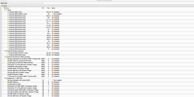 pour ouvrir le SDK Manager, si cela ne fonctionne pas, faites glisser l’exécutable Android sur la fenêtre du terminal et appuyez sur Entrée. Une fois ouvert, assurez-vous d’installer les paquets répertoriés ci-dessous, ainsi que tout autre élément pertinent à ce que vous souhaitez accomplir.