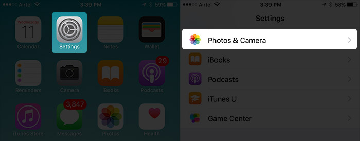 Étape 1. Ouvrez la application Paramètres sur votre appareil iOS -> Tapez sur Photos et caméra.