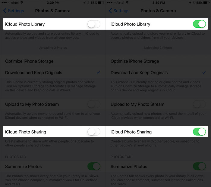 Étape 2. Activez iCloud Photo Library et iCloud Photo Sharing.