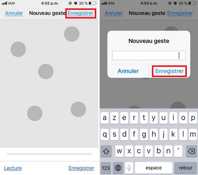 8. Appuyez sur Lecture pour prévisualiser votre geste, Enregistrer pour le réenregistrer ou sur Enregistrer dans le coin supérieur droit pour l’enregistrer.