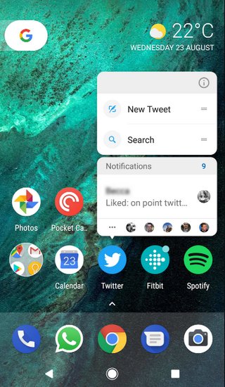 Une fois pressé, vous pouvez voir que dans ce cas Il y a neuf notifications Twitter, et un aperçu de la plus récente. Comme Twitter dans cette instance offre déjà des options de presse longue, celles-ci sont affichées ci-dessus, vous permettant de rechercher pour lancer un nouveau Tweet.