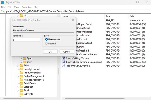 5. Double-cliquez sur PlatformAoAcOverride et saisissez 0 dans le champ Données de la valeur. Une fois terminé, cliquer sur le bouton OK.
