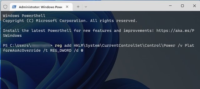 reg add HKLM\System\CurrentControlSet\Control\Power /v PlatformAoAcOverride /t REG_DWORD /d 0