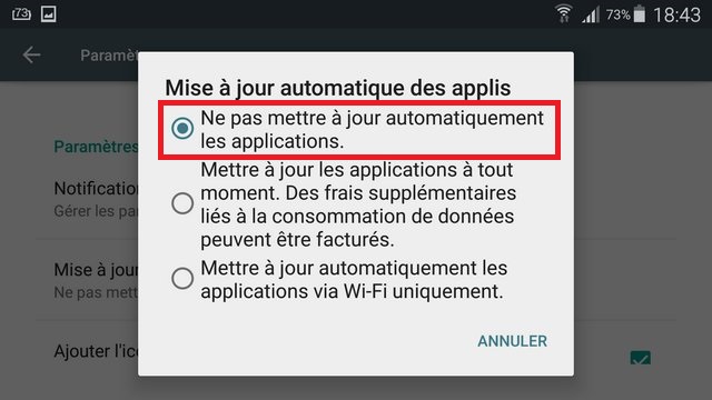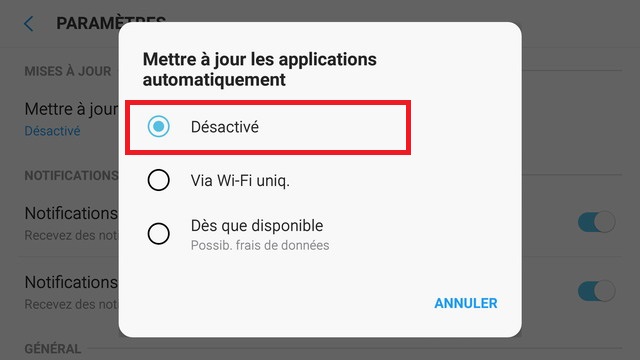 En désactivant les applications de mise à jour automatique, vous aurez plus de contrôle sur votre appareil. De cette façon, les grandes applications et les jeux ne peuvent pas mettre à jour et utiliser votre plan de données complet avant la fin du mois. Nous avons vu des mises à jour de jeu utiliser 1 Go dans une seule mise à jour. Sans compter que vous ne serez pas au courant des changements potentiels à vos applications préférées. Si ce n’est pas une préoccupation et que vous souhaitez vous débarrasser des notifications, sélectionnez pour mettre à jour les applications via Wi-Fi uniquement. De cette façon, les applications seront mises à jour de leur propre chef, mais seulement lorsque vous êtes en WiFi.