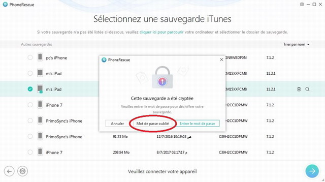 Étape 2. Choisissez la sauvegarde cryptée > Il affichera la fenêtre au-dessous > Cliquez sur Mot de passe oublié.