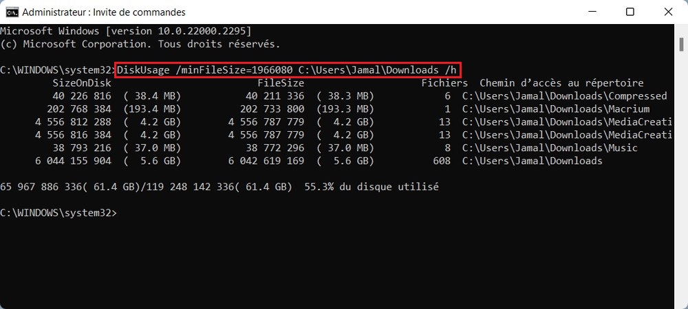 DiskUsage /minFileSize=1966080 C:\Users\utilisateur\Downloads /h
