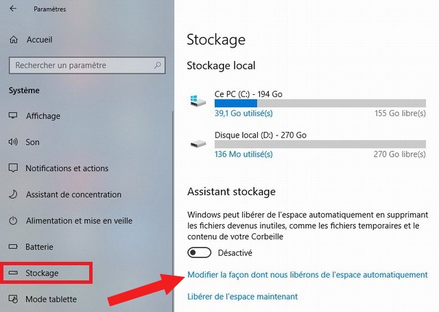 Pour l’activer, ouvrez Paramètres en appuyant sur Windows + I, allez dans Système > Stockage, puis cliquez sur le lien « Modifier la façon dont nous libérons de l’espace automatiquement »